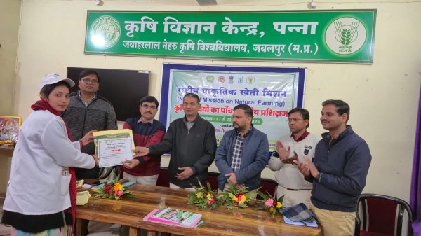 पन्ना -राष्ट्रीय प्राकृतिक खेती मिशन अंतर्गत जिले में रासायनिक खेती के दुष्प्रभावों को कम करने और प्राकृतिक खेती को बढ़ावा देने के उद्देश्य से कृषि विज्ञान केंद्र पन्ना में आयोजित पांच दिवसीय प्रशिक्षण कार्यक्रम का समापन जवाहरलाल नेहरू कृषि विश्वविद्यालय, जबलपुर के प्रमंडल सदस्य संजीव खरे के सानिध्य में संपन्न हुआ। कार्यक्रम में जिले के विभिन्न ग्रामों से चयनित 41 कृषि सखियों ने प्राकृतिक खेती के विभिन्न आयामों से संबंधित प्रशिक्षण प्राप्त किया। विशेषज्ञों ने पांच दिवसीय प्रशिक्षण कार्यक्रम में जैविक और प्राकृतिक खेती के सूक्ष्म अंतर को समझाया और बताया कि कैसे ये सखियां अगले तीन वर्षों तक किसानों को एक एकड़ जमीन पर प्राकृतिक खेती के लिए प्रेरित करेंगी।