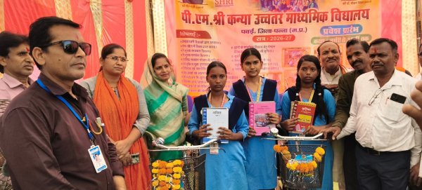 पन्ना - पवई विकासखंड में नवीन शैक्षणिक सत्र 2026-27 के शुभारंभ अवसर पर “स्कूल चलें हम अभियान” के अंतर्गत सभी विद्यालयों में प्रवेश उत्सव बड़े ही उत्साह, उल्लास एवं गरिमामय वातावरण में मनाया गया। विकासखंड के सभी 13 जन शिक्षा केन्द्रों के अंतर्गत संचालित 369 विद्यालयों में एक साथ आयोजित इस कार्यक्रम ने शिक्षा के प्रति जन-जागरूकता का सकारात्मक संदेश प्रसारित किया। विकासखंड स्तरीय मुख्य कार्यक्रम का आयोजन पीएमश्री शासकीय कन्या उच्चतर माध्यमिक विद्यालय पवई में प्राचार्य श्री रामचरण गुप्ता के कुशल संयोजन में संपन्न हुआ। कार्यक्रम का शुभारंभ जनपद अध्यक्ष श्रीमती मोहनी आनंद मिश्रा, जनपद उपाध्यक्ष श्री सुखदेव सिंह, बीईओ हुकम सिंह यादव एवं मंडल अध्यक्ष सुश्री निधि पटेरिया ने सरस्वती पूजा एवं दीप प्रज्वलन से किया। इसके उपरांत मंचासीन अतिथियों का स्वागत चंदन एवं पुष्पहार से किया गया। विद्यालय की बालिकाओं द्वारा गीत और नृत्य की शानदार प्रस्तुति की गई।