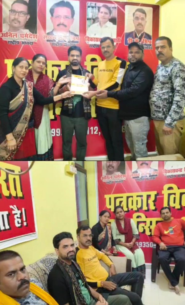 प्रयागराज : अरैल नैनी राष्ट्रीय कार्यालय पत्रकार विकास कॉउंसिल भारत प्रयागराज पहुँचे बृजेश दीक्षित जहां राष्ट्रीय महासचिव डीके मिश्र एवं प्रदेश अध्यक्ष महिला बिंग बबिता शर्मा के सानिध्य में अंगवस्त्र एवं बैच लगाकर प्रशस्ति पत्र से भव्य स्वागत किया गया।