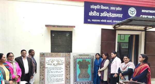 प्रयागराज - भारतीय संविधान दिवस के अवसर पर संविधान पर आधारित प्रदर्शनी का आयोजन क्षेत्रीय अभिलेखागार, संस्कृति विभाग उ0प्र0 एवं जिला प्रशासन प्रयागराज के संयुक्त तत्वावधान मे कार्यालय क्षेत्रीय अभिलेखागार प्रयागराज में किया गया। इस प्रदर्शनी में संविधान की प्रस्तावना, संविधान का निर्माण, भारतीय संविधान में चित्रण-एक सांस्कृतिक यात्रा, संविधान का गौरव और विरासत आदि से सम्बन्धित प्रदर्श को प्रस्तुत किया गया। सभी का स्वागत प्रभारी, क्षेत्रीय अभिलेखागार, गुलाम सरवर के द्वारा किया गया। कार्यक्रम का संयोजन राकेश कुमार वर्मा, प्राविधिक सहायक, इतिहास द्वारा किया गया और आये हुए आगुन्तको को भारत के संविधान के बारे मे बताया। इस अवसर पर रवीन्द्र नाथ, सहायक निदेशक, पत्राचार, सीमा सिंह, मंशा सिंह, रीता यादव, कीर्ति पटेल, प्रिंयंका यादव, सना सिद्दकी, सुमन यादव, दीपिका सिंह एवं नीलम जी की गरिमामयी उपस्थिति रही। कार्यक्रम में विकास यादव, सहायक, शुभम कुमार की उपस्थिति रही।
