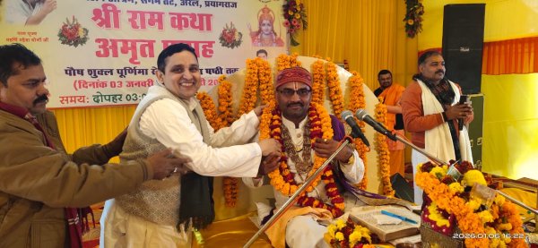 प्रयागराज - महर्षि महेश योगी आश्रम परिसर में आयोजित राम कथा महर्षि आश्रम के अध्यक्ष महर्षि महेश योगी के परम शिष्य वेद मार्तंड ब्रह्मचारी गिरीश श्रीवास्तव के निर्देशन में प्रतिदिन सुबह रुद्राभिषेक का पाठ एवं तीन से पांच बजे तक राम कथा का आयोजन प्रतिदिन हो रहा है मीडिया प्रभारी संजय श्रीवास्तव ने बताया वेद विद्या मार्तंड ब्रह्मचारी गिरीश के निर्देशन के अनुसार आज राम कथा के भूपेंद्र महाराज जी के द्वारा राम जन्म बाल लीला एवं गुरु भक्ति, राम कथा जिसमें कथावाचक भूपेंद्र जी महाराज ने बताया गुरु भक्ति से समस्त कामनाएं पूर्ण होती हैं इस अवसर पर आश्रम प्रभारी बसंत दास ने पूज्य महाराज कथा वाचक भूपेंद्र जी का माल्यार्पण कर स्वागत अभिनंदन किया और कार्यक्रम प्रारंभ किया गया इस अवसर पर आश्रम प्रभारी सुनील श्रीवास्तव आश्रम प्रभारी बसंत दास ऋषि त्रिवेदी विमल मिश्रा सोनू पांडे रोहित तिवारी सचिन दीपक द्विवेदी राजा भैया जितेंद्र दास राजेश पांडे राम मंगल गुप्ता जय मंगल प्रशांत दास सियाराम शर्मा मीडिया प्रभारी संजय श्रीवास्तव उपस्थित रहे।