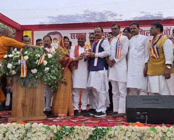 प्रयागराज : जनपद प्रयागराज मे नैनी अरैल स्थित बुद्ध विहार में चक्रवर्ती सम्राट अशोक के महान शिलालेखों के प्रतिलिपियों का भव्य उद्घाटन उपमुख्यमंत्री केशव प्रसाद मौर्य के द्वारा हुआ चक्रवर्ती सम्राट अशोक ने भगवान बुद्ध के विचारों से प्रेरणा लेकर सत्ता के शांति और नैतिकता की स्थापना का आदर्श माध्यम बनाया। इस अवसर पर महानगर अध्यक्ष संजय गुप्ता भाजपा जिला अध्यक्ष राजेश शुक्ला श्रीमती निर्मला पासवान, करछना विधायक पियूष रंजन महापौर प्रयागराज गणेश केसरवानी,, डॉक्टर वाचस्पति माननीय जन प्रति निधि गण पूज्य भिक्षुगण वार्ड 47 की पार्षद सरिता देवी प्रदीप महरा शास्त्री ने केशव प्रसाद मौर्य को भगवान बुद्ध की मूर्ति देकर सम्मानित किया।