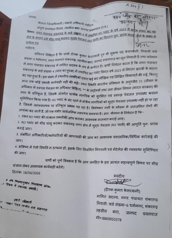 प्रयागराज : नगर पंचायत के नामित सदस्य दीपक केसरवानी ने समाधान दिवस में उठाया मुद्दा लाल का पुरवा वार्ड-4 के सैकड़ों परिवार दो साल से दूषित पानी पीने को मजबूर।