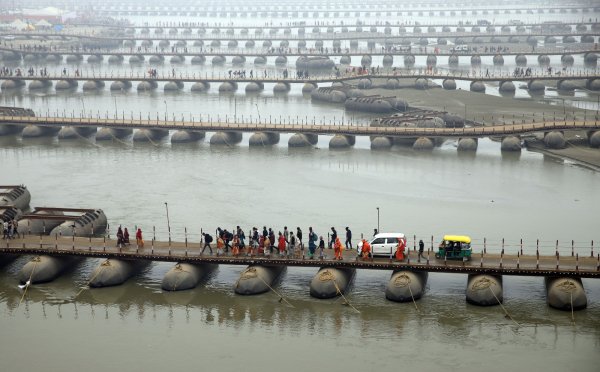 संगम क्षेत्र और अखाड़ों को गंगा नदी के बीच जोड़ते हैं पीपे के पुल