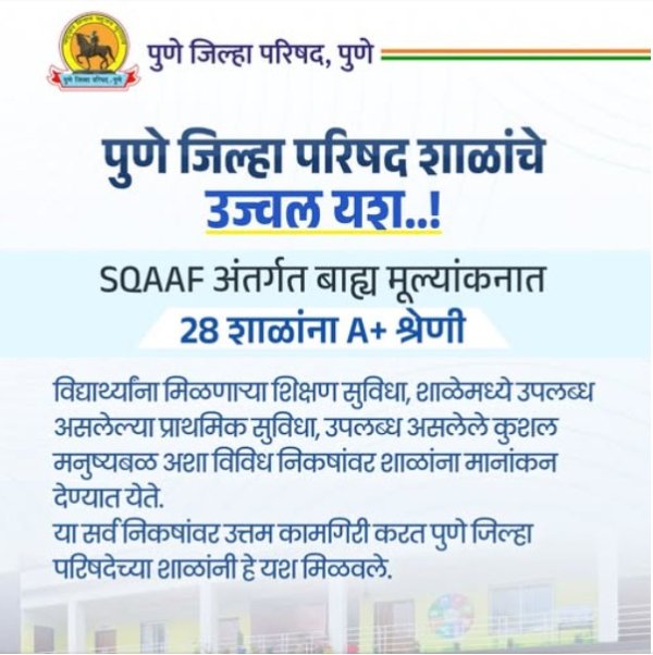 महाराष्ट्र/ पुरंदर (पुणे)- राज्य शैक्षणिक अनुसंधान एवं प्रशिक्षण परिषद (एससीईआरटी) द्वारा संचालित स्कूल गुणवत्ता मूल्यांकन और आश्वासन आराखड़ा (एसक्यूएएएफ) के अंतर्गत पुणे जिला परिषद की कुल 28 प्राथमिक विद्यालयों ने संपूर्ण राज्य में A+ श्रेणी प्राप्त कर उल्लेखनीय सफलता अर्जित की है। यह उपलब्धि जिले के लिए अत्यंत गौरवपूर्ण मानी जा रही है।