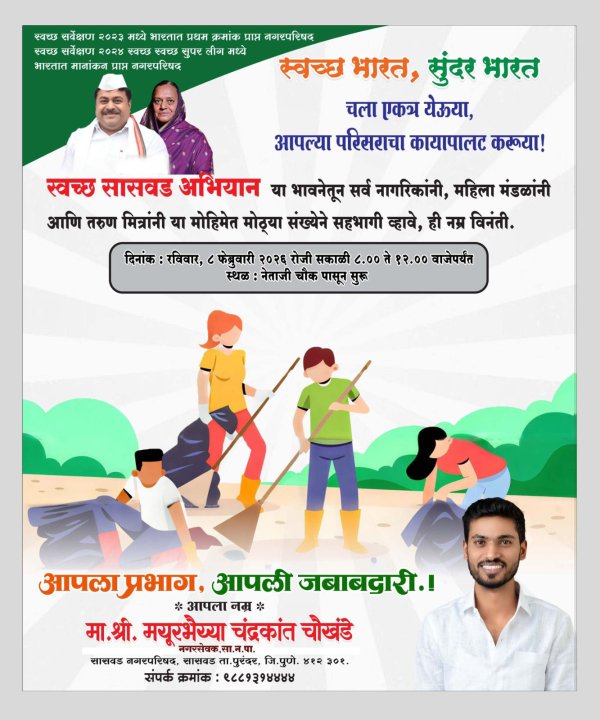 यह स्वच्छता अभियान रविवार, आठ फरवरी दो हजार छब्बीस को सुबह आठ बजे से दोपहर बारह बजे तक नेताजी चौक, सासवड से प्रारंभ होकर विभिन्न क्षेत्रों में चलाया जाएगा। अभियान के माध्यम से सार्वजनिक स्थलों की स्वच्छता, नागरिकों में स्वच्छता के प्रति जागरूकता तथा सामूहिक सहभागिता को प्रोत्साहित करने का उद्देश्य रखा गया है।