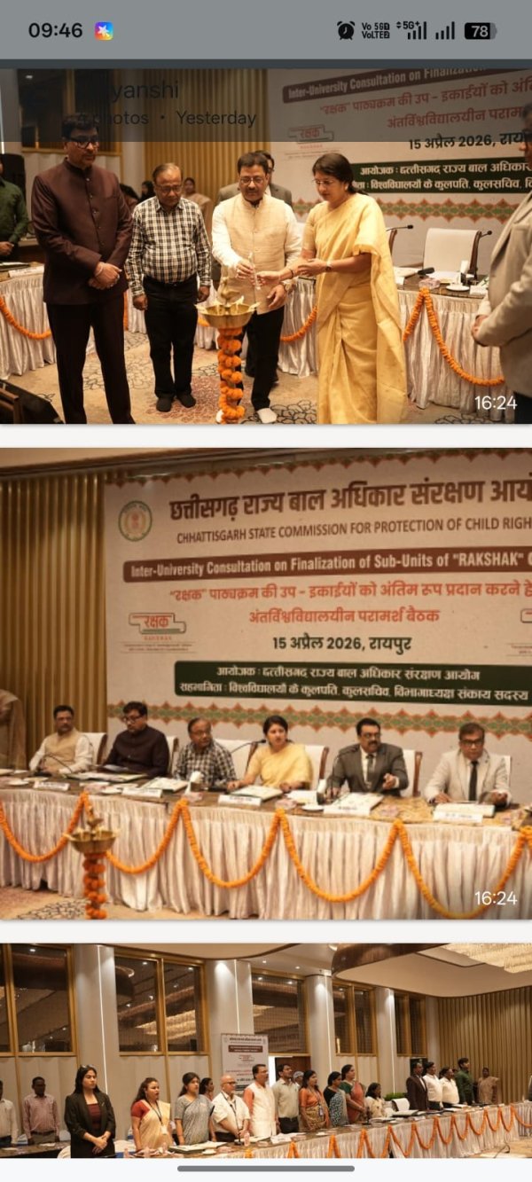रायपुर : छत्तीसगढ़ राज्य बाल अधिकार संरक्षण आयोग, रायपुर द्वारा “रक्षक (RAKSHAK) पाठ्यक्रम” को राज्य में प्रभावी रूप से लागू करने की दिशा में सतत प्रयास किए जा रहे हैं। “रक्षक” पाठ्यक्रम एक विशेष शैक्षणिक पहल है, जिसका उद्देश्य महाविद्यालयीन विद्यार्थियों के माध्यम से बाल अधिकारों के प्रति जागरूकता बढ़ाना, बच्चों की सुरक्षा सुनिश्चित करना तथा समाज में बाल संरक्षण के प्रति संवेदनशीलता विकसित करना है। इस पाठ्यक्रम के क्रियान्वयन हेतु पूर्व में मुख्यमंत्री श्री विष्णुदेव साय जी की उपस्थिति में महिला एवं बाल विकास मंत्री श्रीमती लक्ष्मी रजवाड़े जी तथा उच्च शिक्षा मंत्री श्री टंक राम वर्मा जी के सहयोग से एमओयू संपन्न किया गया था। यह एमओयू राज्य के उच्च शिक्षण संस्थानों में “रक्षक” पाठ्यक्रम को लागू करने की दिशा में एक महत्वपूर्ण कदम रहा है, जिससे विद्यार्थियों को बाल अधिकारों और सुरक्षा संबंधी विषयों में प्रशिक्षित किया जा सके। इसी क्रम में आज दिनांक 15 अप्रैल 2026 को रायपुर स्थित होटल बेबिलोन में “रक्षक” पाठ्यक्रम के अंतर्गत तैयार उप-इकाइयों (सब-यूनिट्स) को अंतिम रूप प्रदान करने हेतु विश्वविद्यालयीन परामर्श बैठक का आयोजन किया गया।