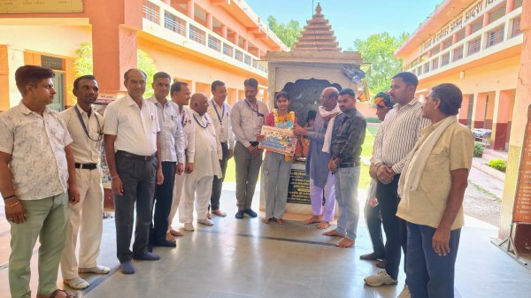 राजस्थान : झालावाड़ जिले के बकानी कस्बे के स्वामी रामेश्वर आदर्श विद्या मंदिर में सत्र 2025/26 में दसवीं बोर्ड परीक्षा में 98% अंक से विद्यालय में प्रथम उत्तीर्ण होने पर ,अंतरराष्ट्रीय हिंदू महासभा प्रदेशअध्यक्ष एवं राष्ट्रीय संगठन सचिव अ.भा.गु.देवसेना के श्री राजाराम हिंदू की अगुवाई में विद्यालय प्रधानाचार्य श्री भारत जी ,शाला परिवार एवं देवसेना के जिलाअध्यक्ष कालू सिंह गुर्जर, तहसील अध्यक्ष राय सिंह गुर्जर आचार्य , जगदीश जी आचार्य,भगवान सिंह आचार्य,राम रतन जी आदि के द्वारा बालिका हेमलता को पुष्प गुच्छ एवं प्रतीक चिन्ह देकर सम्मानित किया। इस अवसर पर छात्र हेमलता ने इस उपलब्धि का श्रेय अपने गुरुजनों एवं माता-पिता को दिया है, जिन्होंने उसका उत्साहवर्धन किया। आशीर्वाद बधाई देते हुए श्री राजाराम हिंदू ने कहा कि,सभी छात्रों को आगे भी ऐसे होनहार छात्रों से प्रेरणा लेकर उत्कृष्ट प्रदर्शन करने की बात कही। तथा सभी गुरू जनों को भी इसके लिए बधाई एवं धन्यवाद दिया।जय मां शारदे।