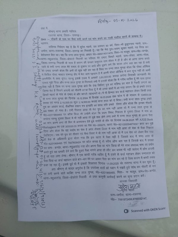 रामगढ़ कैंट आर्मी नौकरी दिलाने का झांसा देकर लाखों रुपए का ठगी
