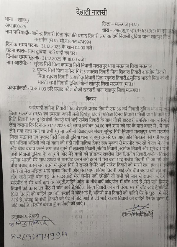 रीवा : मऊगंज जिला के थाना शाहपुर में पीड़ित के आवेदन पर दिनांक 31/12/2025 को शाम 4 बजे एफआईआर क्रमांक 0/25 दर्ज की गई थी, लेकिन हैरानी की बात यह है कि इतने दिन बीत जाने के बाद भी पुलिस की ओर से कोई ठोस कार्रवाई नहीं की गई। इस मामले ने अब केवल पुलिस ही नहीं,बल्कि पूरे प्रशासन की कार्यप्रणाली पर सवाल खड़े कर दिए हैं।*
