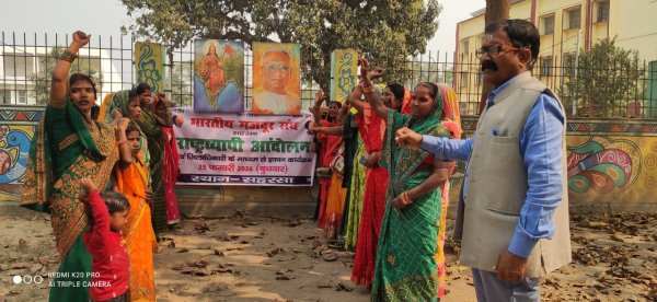 सहरसा : 06, 07 एवं 08 फरवरी को भगवान जगन्नाथ की पावन धरा पूरी उड़ीसा में भारतीय मजदूर संघ का अखिल भारतीय अधिवेशन संपन्न हुआ। जिसमें पूरे देश से लगभग 2500 प्रतिनिधि सम्मिलित हुए।अखिल भारतीय अधिवेशन में लिए गये निर्णय के आलोक में 14 सुत्री माँगों के समर्थन में बुधवार को राष्ट्रव्यापी आंदोलन" के तहत जिला पदाधिकारी कार्यालय के समक्ष 'धरना'प्रदर्शन का कार्यक्रम आयोजित किया गया है।साथ ही मुख्यमंत्री के नाम जिलाधिकारी को ज्ञापन सौपा गया।जिला मंत्री सुभाष चंद्र झा ने बताया कि 14 सुत्री मांग में श्रम कानून को बिना किसी अपवाद के सभी श्रमिकों पर सार्वभौमिक रूप में लागू करने, ठेका श्रमिकों के शोषण को समाप्त करने हेतु कानून में बदलाव करने,ऑगनवाड़ी कर्मियों को कर्मचारी घोषित करते हुए वेतन एवं सामाजिक सुरक्षा का लाभ देने, त्रिपक्षीय तंत्र को पुनः जीवित कर उसे प्रभावी, व्यावहारिक एवं नियंत्रित करने,बैंकों में पाँच दिवसीय कार्य प्रणाली को शुरू करने,सरकारी कर्मियों को पुरानी पेंशन का लाभ देने,अष्टम वेतन आयोग का रिपोर्ट समय सीमा के अंदर शीघ्र अनुमोदित कर समय में इसका लाभकर्मियों को देना सुनिश्चित करने, उत्पादकता पर आधारित बोनस की सीमा को न्यूनतम 18000/- रुपये करने, डाक विभाग में कार्यरत लगभग 3 लाख ग्रामीण डाक सेवकों को सामाजिक सुरक्षा योजना के अंतर्गत पेंशन की सुविधा देने, इ पी एस 95--- न्यूनतम पेंशन 7500/- रुपये करने,इ एस आई सी के लाभार्थी हेतु न्यूनतम आहर्ता 42000 रुपये करने, प्रदेश में मज़दूरों को मिलने वाले लाभ को सुनिश्चित करने के लिए बीओसीडब्लू बोर्ड का गठन करने,