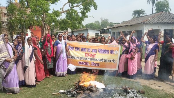 सहरसा : बिहार राज्य आशा एवं फैसिलिटेटर संघ से सम्बद्ध बिहार चिकित्सा एवं जन स्वास्थ्य कर्मचारी संघ सीटू के बैनर तले सामुदायिक प्राथमिक स्वास्थ्य केन्द्र सौर बाजार में आशा एवं आशा फैसिलिटेटर संघ द्वारा राष्ट्रीय व्यापी आह्वान पर मजदूर विरोधी चार लेवर कार्ड बिल वापस लेने, वैक्सीन के आठ माह से बकाए राशि भुगतान करने आदि मांगों को लेकर डबल इंजन सरकार के खिलाफ गगन चुंमी नारे लगाते केन्द्र एवं राज्य सरकार के खिलाफ पुतला दहन किया गया। पुतला दहन के उपरांत फेसिलेटर संघ के नेता मोहन मुखिया के अध्यक्षता में सभा में तब्दील हो गया है सभा को संबोधित करते हुए कहा सीटू नेता व्यास प्रसाद यादव ने कहा आज पुरे देश में मजदूर विरोधी चार लेवर कोर्ड के खिलाफ काला दिवस मना रहे हैं सरकार से मांग करता हूं कि चार लेवर कोर्ड बील रद्द कर पुनः 44 लेवर कोर्ड बील वापस लिया जाए सीपीएम कुलानन्द यादव ने कहा वर्तमान की एनडीए सरकार मजदूर विरोधी जनविरोधी सरकार है सरकार सुनियोजित तरीके से मजदूरों के अधिकार पर हमला कर रहे हैं आशा फैसिलिटेटर सहित सभी संविदा कर्मी को स्थाई करने की मांग किया। आशा संघ जिला मंत्री कुमारी ज्योतिष रानी ने कहा सरकार आशा के साथ भेदभाव कर रहे हैं सरकार अगर हमारी मांगों को अनदेखी किए तो बड़ी संघर्ष में जाएंगे। उपस्थित आशा संघ के प्रखंड मंत्री अमृता कुमारी, सचिदानंद यादव सीपीएम नेता रमेश यादव,रंजना कुमारी रीता कुमारी अमृता कुमारी,मीरा कुमारी, कंचन कुमारी,मीना कुमारी, मंजु कुमारी,नीलम कुमारी सहित अन्य लोगों ने संबोधित किया।