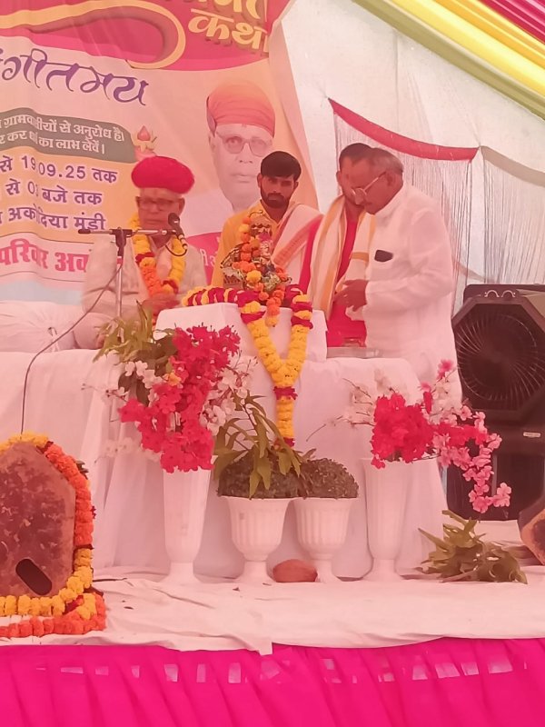 नगर परिषद अकोदिया के पूर्व अध्यक्ष दौलत सिंह मंडलोई के निवास पर चल रहे पितृ भागवत कथा आयोजन