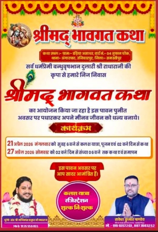 सर्व धर्मप्रेमी बन्धुओं को इस पावन अवसर पर सादर आमंत्रित किया गया है। कार्यक्रम 21 अप्रैल 2026, मंगलवार को सुबह 6 बजे से कलश यात्रा व पूजन होगा। उसी दिन दोपहर 2 बजे से कथा प्रारंभ होगी। कथा का समापन 27 अप्रैल 2026, सोमवार को दोपहर 2 बजे से संध्या 6 बजे तक होगा।
