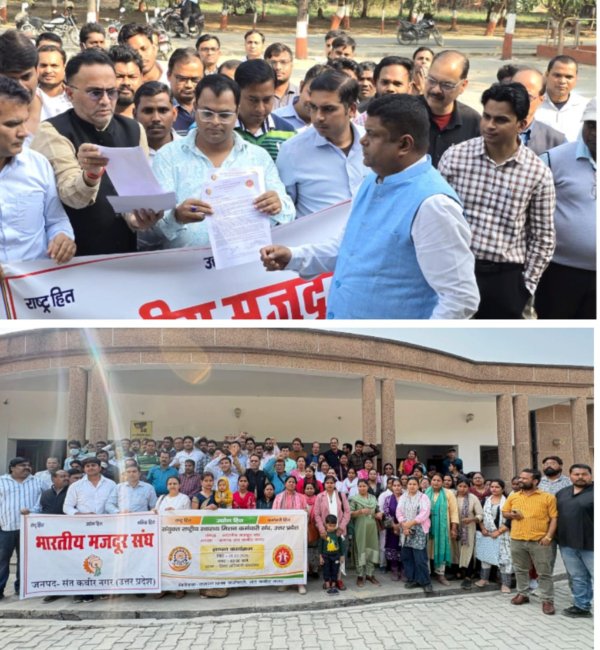 संत कबीर नगर : संयुक्त राष्ट्रीय स्वास्थ्य मिशन कर्मचारी संघ और भारतीय मजदूर संघ के संयुक्त तत्वाधान में राष्ट्रव्यापी ज्ञापन कार्यक्रम का आयोजन देशभर के जिला मुख्यालयों पर किया गया, इसी क्रम में संत कबीर नगर स्थित जिलाधिकारी कार्यालय पर राष्ट्रीय स्वास्थ्य मिशन (NHM) उत्तर प्रदेश के अंतर्गत कार्यरत संविदा कार्मिकों ने अपनी विभिन्न लंबित समस्याओं को लेकर प्रधानमंत्री और मुख्यमंत्री को संबोधित ज्ञापन जिलाधिकारी के माध्यम से भेजा. कार्मिकों का कहना है कि वर्षों से प्रदेश की स्वास्थ्य व्यवस्था की रीढ़ बनकर कार्य करने के बावजूद उन्हें वेतन विलंब, सेवा असुरक्षा और सामाजिक सुरक्षा के अभाव जैसी गंभीर चुनौतियों का सामना करना पड़ रहा है।