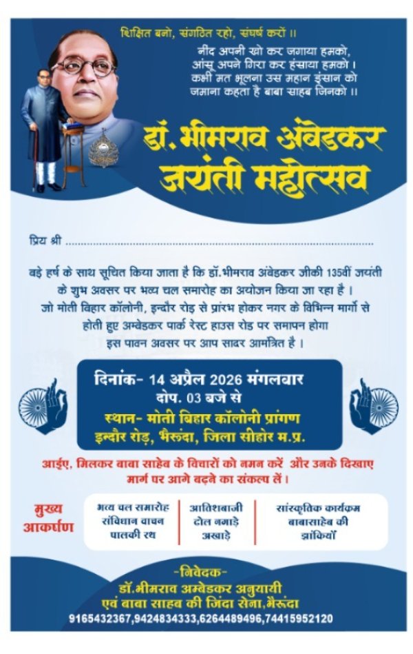 सीहोर : भैरूंदा बाबा साहब की जिन्दा सेना और उनके अनुयाई द्वारा प्रतिवर्ष अनुसार इस वर्ष भी परम पूज्य बाबा साहब डॉक्टर अंबेडकर जयंती समारोह 2026 14 अप्रैल को भव्य आकर्षक रूप से मनाई जाएगी दलित चिंतक संतोष गौर ने बताया कि हमारे संविधान निर्माता विश्व रतन बाबा साहब डॉक्टर अंबेडकर जी को सर्व समाज के लोग सम्मान करते हैं क्योंकि बाबा साहब ने सर्वजन हिताय सर्वजन सुखाय के तहत संविधान का निर्माण किया है हमारे देश में विभिन्न धर्म जाति उपजाति के लोग रहते हैं अलग-अलग संस्कृति अलग-अलग बोली होने के बाद भी हमारा देश एक सूत्र बन्धन बंधा हुआ है तो उसका मूल कारण हमारा संविधान है विश्व में एक जाति धर्म के मानने वाले हैं लेकिन वहां पर अराजकता अशांति आपसी लड़ाइयां है इसका उदाहरण हमारे पड़ोसी देश है लेकिन भारत इतना विशाल देश होने की वजह से भी एक है ऐसे संविधान लिखने वाले महामानव की जयंती 14 अप्रैल को भव्य शोभायात्रा मोती विहार कॉलोनी भेरूंदा से प्रारंभ होकर बाबासाहेब अंबेडकर पार्क रेस्ट हाउस के पास भेरूंदा मैं समापन होगा सभी लोगों से निवेदन है कि ज्यादा से ज्यादा संख्या में उपस्थित होकर उक्त कार्यक्रम को सफल बनाएं कार्यक्रम को सफल बनाने के लिए अपील करने वालों में मुख्य रूप से युवा साथी जितेंद्र धवन भूरा विवेक दोगने नितेश पेठारी पार्षद /राजेश बकोरिया सरपंच सिंहपुर संजय बकोरिया सरपंच तजपुरा शिवनारायण बाकरियां सरपंच निम्न गांव समाज के वरिष्ठ गण ओ पी झरानिया केवल राम सोनिया रेवाराम जाटव अशोक इरपाचे बलराम यादव एडवोकेट बहादुर सिंह बगाना जय नारायण काचले गबूलाल सरसवाल आदि प्रमुख हैं