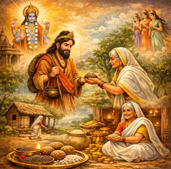 भगवान विष्णु उसकी भक्ति से प्रसन्न हुए, लेकिन उन्होंने देखा कि ब्राह्मणी ने कभी दान नहीं किया था। बिना दान के व्रत का पुण्य अधूरा माना जाता है। यह सोचकर भगवान स्वयं भिक्षुक का रूप धारण कर उसके घर पहुँचे। ब्राह्मणी के पास देने को कुछ भी नहीं था, तो उसने श्रद्धा से भगवान को मिट्टी का एक पिंड दान में दे दिया।