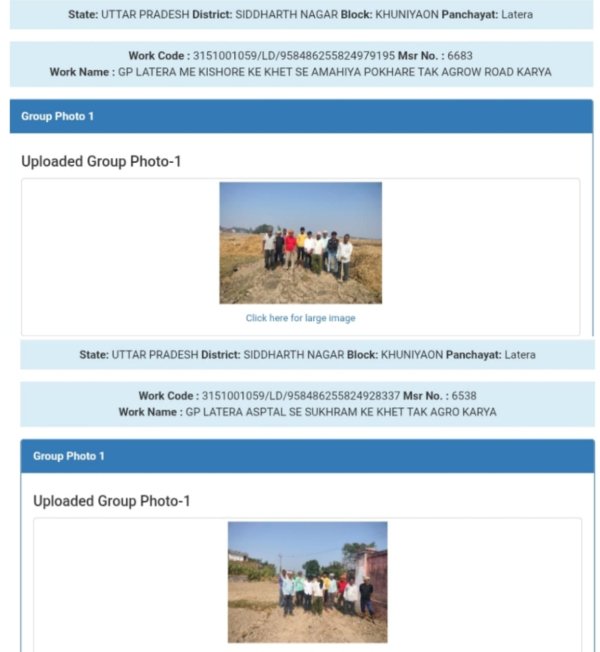 सिद्धार्थनगर : खुनियाव ब्लॉक के ग्राम पंचायत लटेरा में मनरेगा घोटाले का एक और चौंकाने वाला खुलासा सामने आया है। दो अलग-अलग परियोजनाओं में एक ही फोटो से मजदूरों की हाजिरी चढ़ाई जा रही है। रिकॉर्ड के अनुसार, 14 दिनों में कुल 1201 फर्जी मजदूरों की हाजिरी लगाकर ₹3,02,652 का घोटाला कर दिया गया। दो प्रोजेक्ट, एक फोटो—और 1201 मजदूर हाजिर ग्राम पंचायत लटेरा में चल रही निम्न परियोजनाओं पर यह गड़बड़ी पकड़ में आई—कार्य कोड: 3151001059/LD/958486255824928337, कार्य का नाम: GP लेटरा हॉस्पिटल से सुखराम के खेत तक कृषि कार्य मास्टर रोल नंबर: 6538 से 6683 दोनों ही परियोजनाओं में एक ही मजदूर की फोटो को बार-बार चिपका कर मजदूरों की भारी संख्या दिखा दी गई। स्थानीय लोगों के अनुसार कई मजदूरों ने तो इस साइट पर कभी काम किया ही नहीं, पर वे रिकॉर्ड में हर दिन हाजिर दिखाए गए हैं।14 दिन में ₹3,02,652 का खेल मास्टर रोल में 1201 मजदूरों की उपस्थिति दिखाकर ₹3.02 लाख से अधिक की मजदूरी बिल बनाया गया। जांच में यह भी स्पष्ट हुआ कि हाजिरी में दिन-प्रतिदिन वही फोटो कॉपी-पेस्ट की गई है। जिम्मेदारों पर सवाल, पर जवाबदेही लापता जब मामले की जानकारी खण्ड विकास अधिकारी (BDO) को दी गई, तो उन्होंने मोबाइल फोन पर बातचीत में जांच कराने का आश्वासन तो दिया, लेकिन अब तक किसी कार्रवाई की पुष्टि नहीं हो सकी है। ग्रामीणों का कहना है कि यह घोटाला अकेले ग्राम पंचायत स्तर पर नहीं हो सकता। बड़े अधिकारी की मिलीभगत के बिना इतनी बड़ी फर्जी हाजिरी संभव नहीं है। ग्रामीण बोले—काम नहीं, सिर्फ कागजों में खदानें खनक रही हैं मामले पर स्थानीय निवासियों का कहना है कि मनरेगा को गरीब मजदूरों की रोजी-रोटी के लिए चलाया जाता है, लेकिन यहां मजदूरों की जगह फोटो का खेल चल रहा है। एक ग्रामीण ने कटाक्ष करते हुए कहा— यहां तो फोटो कमाती है, मजदूर नहीं। जांच हुई तो कई चेहरे बेनकाब होने तय मामला उजागर होने के बाद अब पंचायत सचिव, रोजगार सेवक, तकनीकी सहायक और उच्च अधिकारियों की भूमिका जांच के घेरे में आ गई है।जानकारों के मुताबिक, यदि निष्पक्ष जांच हुई तो कई अफसरों के तबादले-निलंबन तक तय हैं।