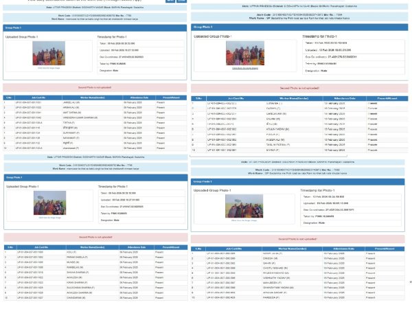 बताया जा रहा है कि कार्य-मओवर के खेत से बबलू सिंह के खेत तक चकबंद निर्माण कार्य (आईडी: 3151004037/LD/YD/958486255824989752) में 9 फरवरी 2026 से जारी मास्टररोल के दौरान कई तरह के फोटो से,..... फोटो के माध्यम से हाजिरी दर्ज की जा रही है।इसी तरह दिनाँक 14/02/2026 से शुरू कार्य- ग्राम पंचायत गडरखा में पिच रोड़ से राजा राम के खेत तक नाला खुदाई id स0 3151004037/IC/YD/958486255823743972 के दिनाँक 15/02/2026 के MR स0 7884,7885 से लिये गए हाजिरी के फोटो व 09/02/2026 के कार्य- MR स0 7768,7769 से मैच कर रहे हैं,और लेबरों के नाम भी भिन्न है।आरोप है कि वास्तविक उपस्थिति के बिना मजदूरों के नाम पर भुगतान निकालने की कोशिश की जा रही है। सूत्रों के अनुसार, कार्यस्थल पर 169 मजदूरों की उपस्थिति दर्शाकर प्रतिदिन लगभग 42,588 रुपये के घोटाले की आशंका जताई जा रही है। पुनः नए कार्य पर 220 लेबरों की 220x252=55440 रु की फोटो से हाजिरी लगाई जा रही है। यह भी आरोप है कि मनरेगा के स्पष्ट निर्देशों और जिला स्तर से जारी कड़े आदेशों के बावजूद कार्यस्थलों पर दोनों पारियों में उपस्थिति दर्ज नहीं कराई जा रही है। स्थानीय लोगों का कहना है कि बढ़नी क्षेत्र की कई ग्राम पंचायतों में एक ही पारी में हाजिरी लगाकर भुगतान लिया जा रहा है। ऐसे में सवाल उठ रहा है कि यह सब खंड विकास अधिकारी की अनदेखी है या फिर दबंग सचिव की मनमानी। ग्रामीणों ने मामले की निष्पक्ष जांच कर दोषियों के खिलाफ सख्त कार्रवाई की मांग की है, ताकि सरकारी धन के दुरुपयोग पर रोक लगाई जा सके।