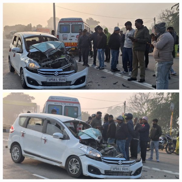 वाराणसी की तरफ से आ रही कार बस में पीछे से टकराई कार सवार तीन श्रद्धालु घायल