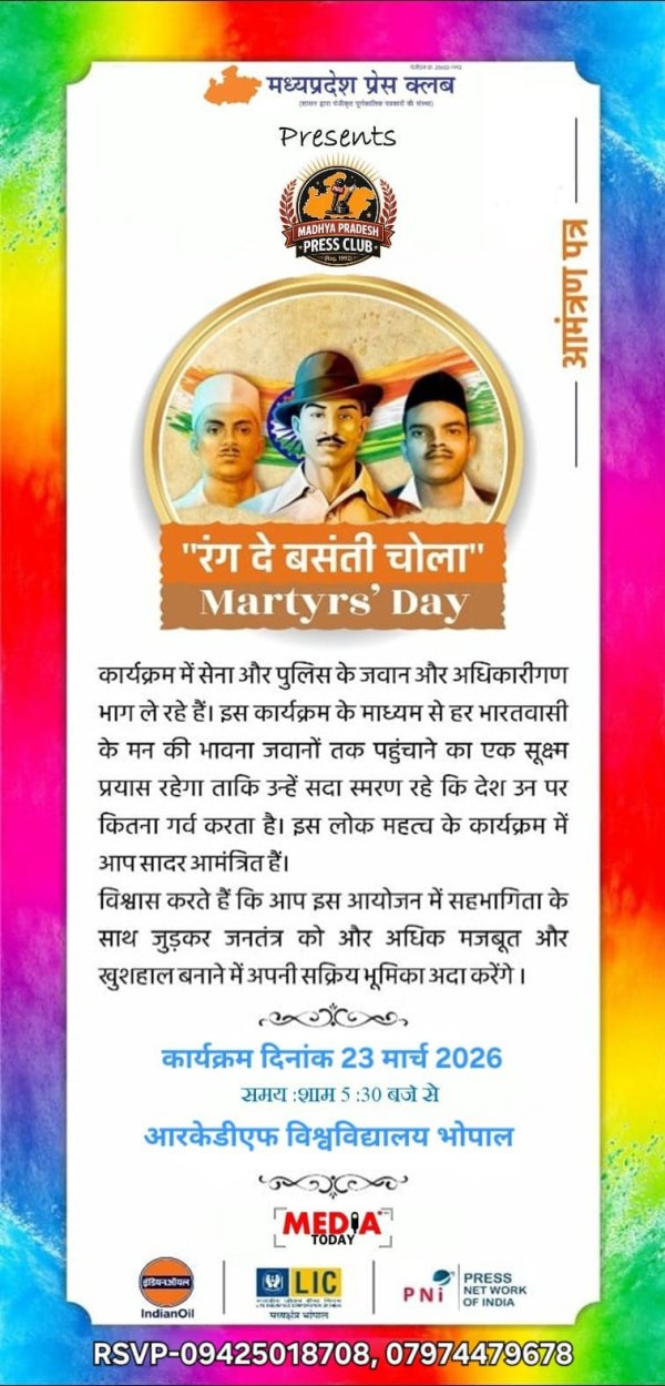 उज्जैन - मध्य प्रदेश प्रेस क्लब सदैव न केवल पत्रकारिता के उन्नयन और विकास हेतु समर्पित रहा है, बल्कि सामाजिक सरोकार, राष्ट्रभक्ति और जनसेवा के मूल्यों को भी अपने कार्यों के केंद्र में रखता आया है। इसी परंपरा को आगे बढ़ाते हुए आज दिनांक 23 मार्च को अमर शहीद भगत सिंह, राजगुरु एवं सुखदेव के बलिदान दिवस पर एक विशेष कार्यक्रम “रंग दे बसंती चोला” का आयोजन किया जा रहा है।