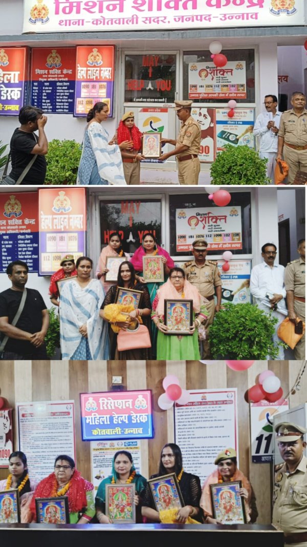 उन्नाव : में पुलिस अधीक्षक जय प्रकाश सिंह के कुशल निर्देशन में एवं शासन की मंशा अनुसार मिशन शक्ति के पांचवें चरण में शारदीय नवरात्रि के अंतर्गत प्रभारी निरीक्षक कोतवाली सदर संजीव कुशवाहा की अध्यक्षता में पांच विभिन्न क्षेत्रों की महिलाओं का नवरात्रि के अष्टम दिन सम्मान किया गया। जिसके अंतर्गत विभिन्न क्षेत्र जैसे पत्रकारिता जगत से वरिष्ठ पत्रकार कुमकुम कुमारी, समाजसेवा के क्षेत्र एवं महिला सभासद नीलम यादव, शिक्षा जगत से शिक्षिका कुमारी पायल गुप्ता, कोतवाली सदर हेल्पडेस्क में मिशन शक्ति में अच्छा कार्य कर रही आरक्षी शिखा यादव व ग्राम पंचायत सदस्य काजल को दुर्गा जी का प्रतीक चिन्ह व पुष्पगुच्छ, माला व अंग वस्त्र पहना कर सम्मान किया गया। और सभी महिलाओं ने उन्नाव पुलिस की सराहनीय पहल की सराहना की और बताया कि शासन द्वारा प्रदत्त हेल्पलाइन नंबर से हम सभी को बहुत सुविधा मिलती है अब हम रात में भी कहीं जाने में अपने आप को असुरक्षित नहीं बल्कि सुरक्षित महसूस करते हैं कार्यक्रम का पूरा संचालक व समन्वयं बड़ी ही कुशलता के साथ डॉ० आशीष श्रीवास्तव प्रभारी परिवार परामर्श केंद्र समिति ने किया।