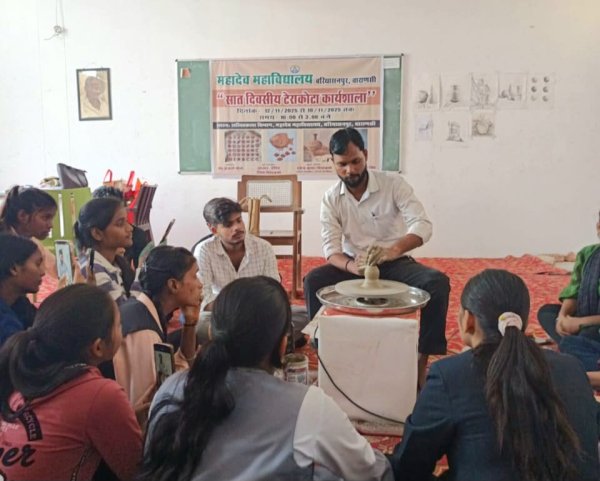 वाराणसी : महादेव महाविद्यालय बरियासनपुर, वाराणसी में ललित कला विभाग द्वारा आयोजित सात दिवसीय टेराकोटा कार्यशाला का भव्य शुभारंभ किया गया। कार्यक्रम का शुभारंभ महाविद्यालय के प्राचार्य डॉ० दयाशंकर सिंह द्वारा दीप प्रज्वलन के साथ किया गया। कार्यशाला के मुख्य अतिथि स्वतंत्र कलाकार रातेंद्र कुमार विश्वकर्मा थे, जो पॉटरी और सेरेमिक कला के विशेषज्ञ हैं। उन्होंने छात्र-छात्राओं को टेराकोटा, पॉटरी, सेरेमिक, म्यूरल आर्ट, परंपरागत मिट्टी के खिलौने, मुखौटे, फ्लावर पॉट तथा टेराकोटा आभूषण निर्माण जैसी विधाओं की तकनीकी जानकारी विस्तार पूर्वक दी। विश्वकर्मा ने विद्यार्थियों को मिट्टी की गुणवत्ता, आकार निर्माण, फायरिंग प्रक्रिया तथा पारंपरिक कला के संरक्षण पर विशेष रूप से मार्गदर्शन किया।