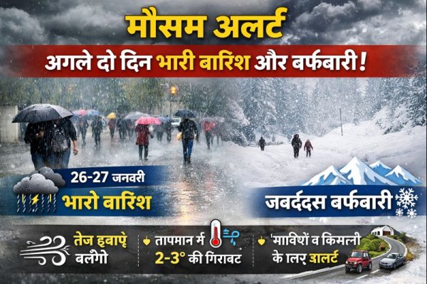 IMD के मुताबिक, 26 और 27 जनवरी तक देश के कई हिस्सों में भारी बारिश, बर्फबारी और तेज़ हवाओं की संभावना है। इस दौरान तापमान में 2 से 3 डिग्री सेल्सियस तक की गिरावट दर्ज की जा सकती है, जिससे ठंड और ज्यादा बढ़ेगी।