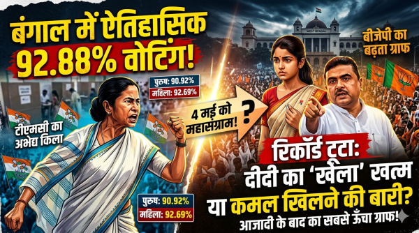 कुल मिलाकर देखा जाए तो बंगाल की इस महा वोटिंग ने बड़े-बड़े राजनीतिक पंडितों के गणित फेल कर दिये हैं। ऐसे में सवाल उठ रहे हैं कि क्या यह 10% बढ़ा हुआ वोट ममता बनर्जी के प्रति अटूट विश्वास है या फिर सत्ता विरोधी लहर का वो ज्वालामुखी जो 4 मई को फटेगा? बीजेपी का बढ़ता ग्राफ और टीएमसी का अटूट किला, दोनों के बीच की ये टक्कर अब उस मोड़ पर है जहां एक-एक वोट की कीमत सोने से भी महंगी हो गई है। अब सभी को बस 4 मई का इंतजार है, जब ये सियासी बम फूटेगा।