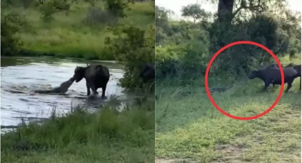 अब कोई और होता तो शायद डर के मारे हार मान लेता, लेकिन ये भैंस कुछ अलग ही निकली। उसने पूरा ज़ोर लगा दिया – एक-एक कर झटके मारती गई, और आखिरकार मगरमच्छ की पकड़ से खुद को छुड़ा लिया। जैसे ही छूटी, उसने बिना पीछे देखे दौड़ लगा दी!