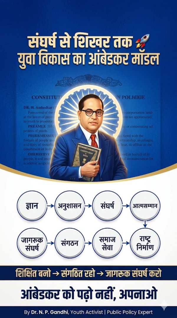 डॉ. आंबेडकर का जीवन आज के भावी युवा और समाज को सिखाता है कि संघर्ष जीवन का अंत नहीं, बल्कि एक नई शुरुआत है। उनका “समर्पण मॉडल” केवल व्यक्तिगत सफलता तक सीमित नहीं है, बल्कि वह समाज और राष्ट्र के विकास से जुड़ा हुआ है।आज के युवाओं के लिए यह आवश्यक है कि वे आंबेडकर के जीवन से प्रेरणा लेकर अपने भीतर धैर्य, अनुशासन और देशप्रेम को विकसित करें।जब युवा अपने व्यक्तिगत लक्ष्यों को राष्ट्रहित से जोड़ते हैं, तभी एक सशक्त और समृद्ध भारत का निर्माण संभव होता है।इसलिए, आज के समय में आंबेडकर का जीवन केवल पढ़ने का विषय नहीं, बल्कि अपनाने का मार्ग है,एक ऐसा मार्ग, जो संघर्ष से शुरू होकर शिखर तक पहुंचता है और अंततः राष्ट्रनिर्माण में परिवर्तित हो जाता है।
