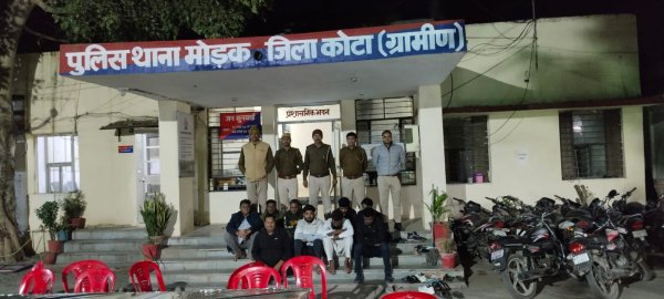 कार्यवाही का विवरणः- कोटा ग्रामीण पुलिस अधीक्षक के निर्देशन में अवैध जुआ-सटटा, अवैध हथियार, अवैध मादक पदार्थ व आदतन अपराधियों के विरूद्ध कार्यवाही करने व प्रकरणो मे वांछित अपराधियो की धरपकड हेतु विशेष अभियान चलाया गया। अभियान को सफल बनाने हेतु अतिरिक्त पुलिस अधीक्षक रामकल्याण मीणा के सुपुरविजन में, पुलिस उप अधीक्षक वृत रामगंजमंडी घनश्याम मीणा के निकटतम सुपरविजन एवं थानाधिकारी थाना मोडक उतम सिंह उनि नेतृत्व में विशेष टीम का गठन कर कार्यवाही करने बाबत दिशा निर्देश दिये गये थे। गठित विशेष टीम द्वारा मुखबिर तंत्र अपनी कार्यकुशलता एवं लगातार प्रयासो से अवैध जुआ के खिलाफ कार्यवाही करते हुये अभियुक्त जाहिद, मेवालाल, रईस, मुस्ताक, अब्दुल वहीद, सरताज, मजहर खान, शेर खान व जगदीश को गिरफतार कर उनके कब्जे से जुआ रकम 13,800 रूपये बरामद किये गये।