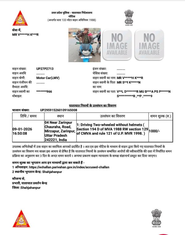 शाहजहांपुर : उत्तर प्रदेश पुलिस का ‘स्मार्ट’ ई-चालान सिस्टम एक बार फिर सवालों के घेरे में है। इस बार मामला शाहजहांपुर का है, जहां एक चार पहिया कार का चालान “बिना हेलमेट” में काट दिया गया—जबकि गाड़ी उस समय घर के बाहर खड़ी थी।